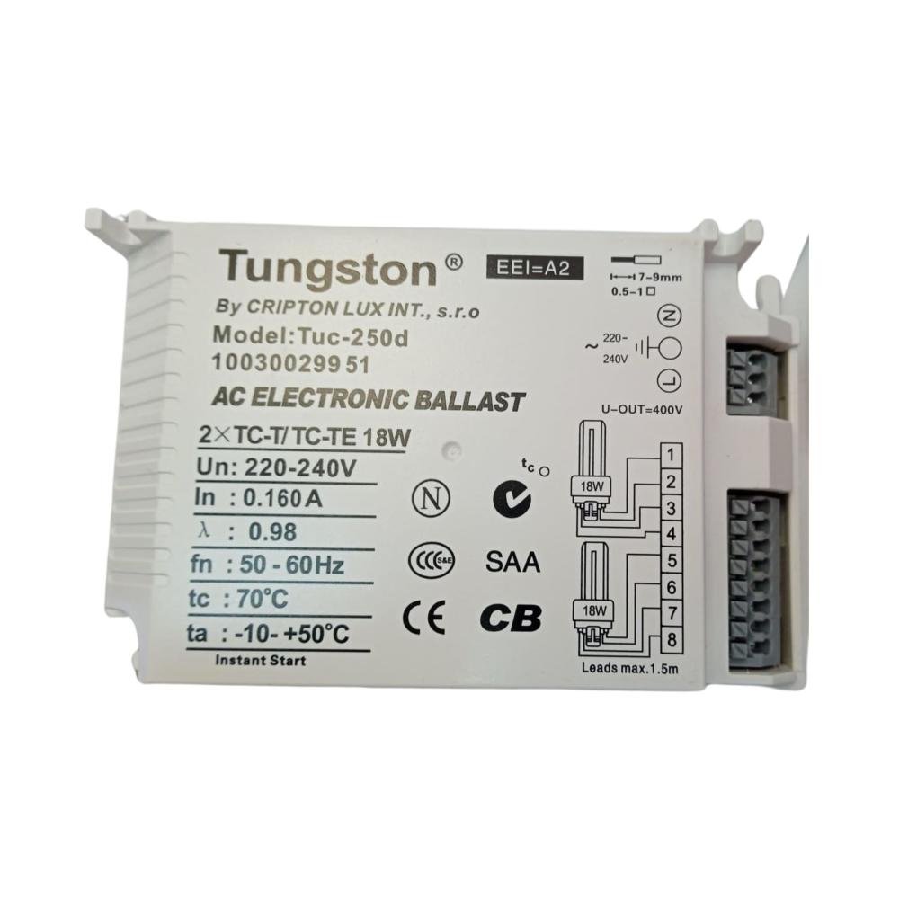 Upgrade your lighting system with the Tungston Electronic Ballast, engineered for optimal performance and energy efficiency. Designed to power 2×18W TC-T/TC-TE compact fluorescent lamps, this ballast ensures flicker-free operation, extended lamp life, and reduced energy consumption.