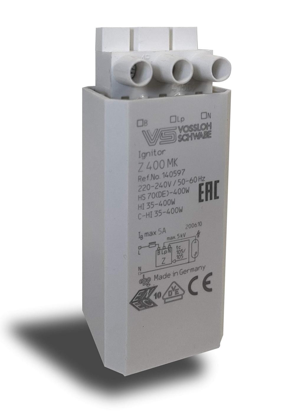 The VS Z400 MK Ignitor is a high-quality, reliable ignitor designed for use with 400W Metal Halide (MH) and High Pressure Sodium (HPS) lamps. It provides efficient and consistent starting performance, ensuring the longevity and optimal operation of your lighting system. The VS Z400 MK Ignitor is specifically designed to handle high ignition voltages and provides a stable electrical pulse to ignite the lamp quickly and reliably.